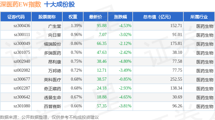 深医药EW(399676)指数十大成份股详情如下: