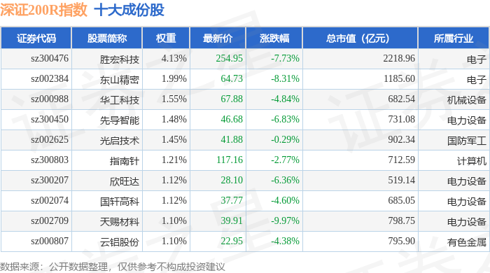 证券之星消息,11月21日,深证200R(399679)指数报收于5737.57点,跌4.19%,成交1671.31亿元,换手率2.02%。当日该指数成份股中,上涨的有7家,长盈精密以3.55%的涨幅领涨,下跌的有192家,天华新能以19.71%的跌幅领跌。