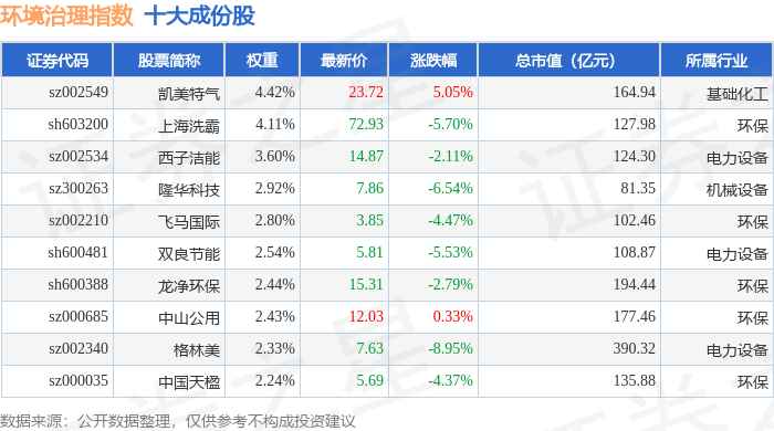 资金流向方面,环境治理(399806)指数成份股当日主力资金净流出合计6.61亿元,游资资金净流出合计1.67亿元,散户资金净流入合计8.28亿元。成份股资金流向详情见下表: