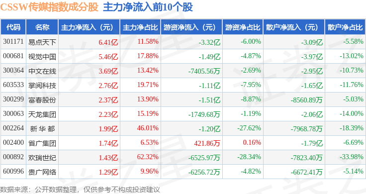资金流向方面,CSSW传媒(399810)指数成份股当日主力资金净流入合计18.05亿元,游资资金净流出合计4.56亿元,散户资金净流出合计13.49亿元。成份股资金流向详情见下表: