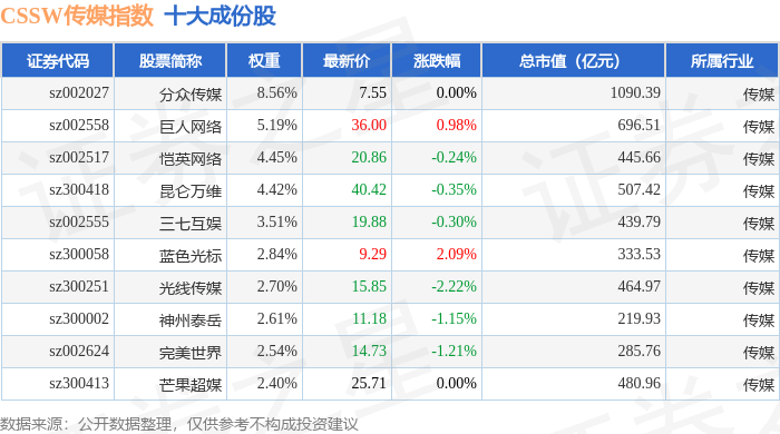 CSSW传媒(399810)指数十大成份股详情如下: