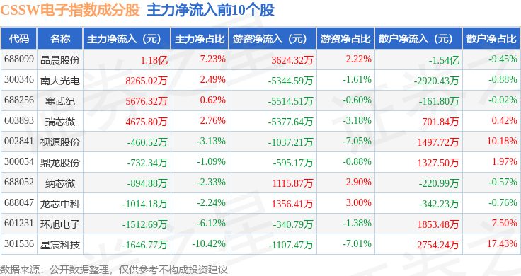 资金流向方面,CSSW电子(399811)指数成份股当日主力资金净流出合计128.95亿元,游资资金净流入合计29.12亿元,散户资金净流入合计99.83亿元。成份股资金流向详情见下表: