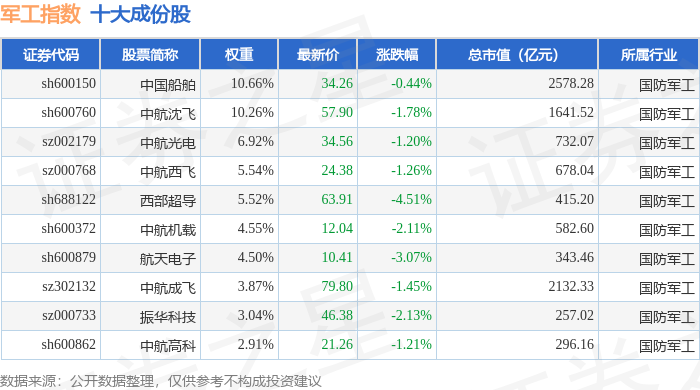 军工指数(399959)十大成份股详情如下: