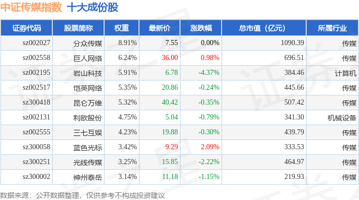 中证传媒(399971)指数十大成份股详情如下: