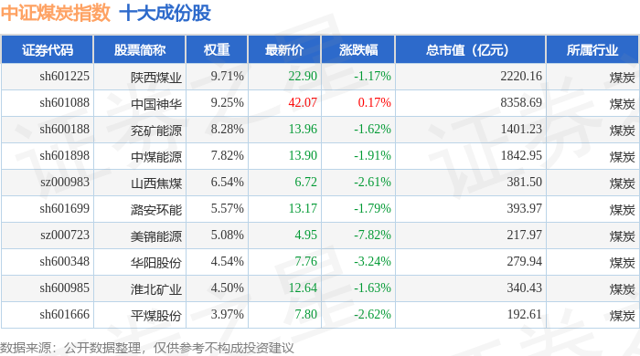 中证煤炭(399998)指数十大成份股详情如下: