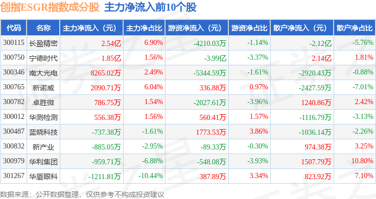 资金流向方面,创指ESGR(470028)指数成份股当日主力资金净流出合计136.94亿元,游资资金净流入合计40.76亿元,散户资金净流入合计96.18亿元。成份股资金流向详情见下表: