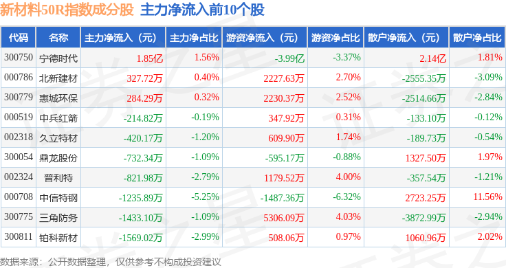 资金流向方面,新材料50R(470042)指数成份股当日主力资金净流出合计70.9亿元,游资资金净流入合计5.81亿元,散户资金净流入合计65.09亿元。成份股资金流向详情见下表: