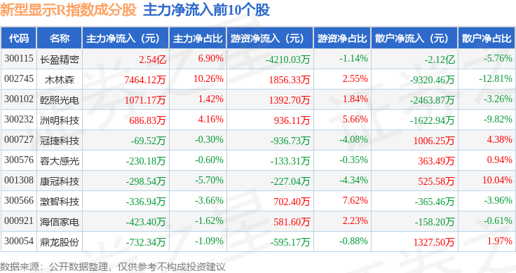 资金流向方面,新型显示R(470048)指数成份股当日主力资金净流出合计38.57亿元,游资资金净流入合计9.02亿元,散户资金净流入合计29.55亿元。成份股资金流向详情见下表: