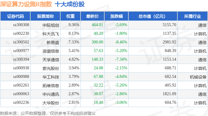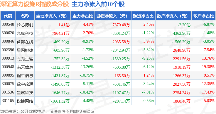 资金流向方面,深证算力设施R(470051)指数成份股当日主力资金净流出合计94.61亿元,游资资金净流入合计33.43亿元,散户资金净流入合计61.19亿元。成份股资金流向详情见下表: