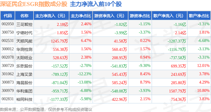 资金流向方面,深证民企ESGR(470056)指数成份股当日主力资金净流出合计80.37亿元,游资资金净流入合计15.88亿元,散户资金净流入合计64.49亿元。成份股资金流向详情见下表:
