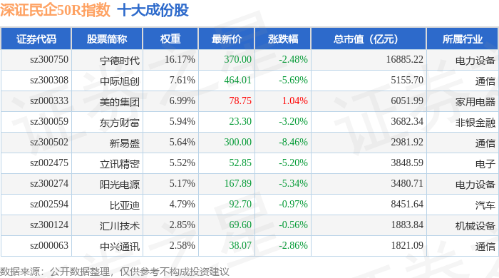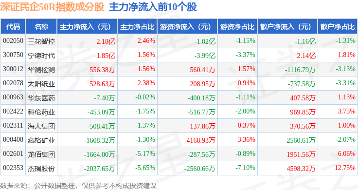 资金流向方面,深证民企50R(470057)指数成份股当日主力资金净流出合计122.62亿元,游资资金净流入合计39.89亿元,散户资金净流入合计82.73亿元。成份股资金流向详情见下表: