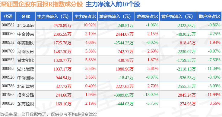 资金流向方面,深证国企股东回报R(470064)指数成份股当日主力资金净流出合计23.76亿元,游资资金净流入合计4.35亿元,散户资金净流入合计19.41亿元。成份股资金流向详情见下表: