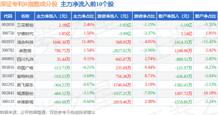 资金流向方面,深证专利R(470067)指数成份股当日主力资金净流出合计50.64亿元,游资资金净流入合计3.73亿元,散户资金净流入合计46.91亿元。成份股资金流向详情见下表:
