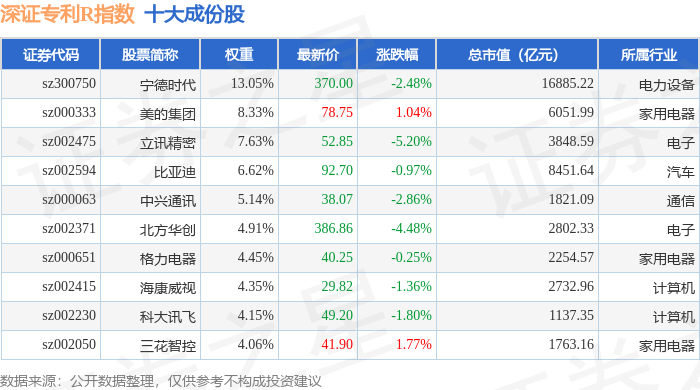 证券之星消息,11月21日,深证专利R(470067)指数报收于5656.14点,跌2.29%,成交751.84亿元,换手率1.49%。当日该指数成份股中,上涨的有4家,三花智控以1.77%的涨幅领涨,下跌的有46家,新雷能以6.55%的跌幅领跌。