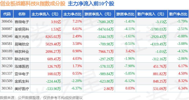 资金流向方面,创业板战略科技R(471004)指数成份股当日主力资金净流出合计21.91亿元,游资资金净流入合计8641.39万元,散户资金净流入合计21.04亿元。成份股资金流向详情见下表: