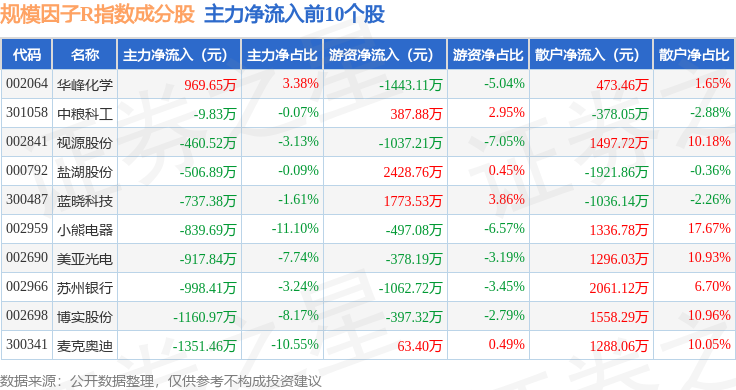 资金流向方面,规模因子R(480055)指数成份股当日主力资金净流出合计47.51亿元,游资资金净流入合计10.44亿元,散户资金净流入合计37.06亿元。成份股资金流向详情见下表: