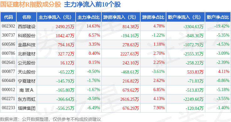 资金流向方面,国证建材R(480048)指数成份股当日主力资金净流出合计6.03亿元,游资资金净流入合计9535.09万元,散户资金净流入合计5.08亿元。成份股资金流向详情见下表: