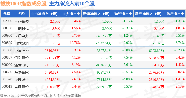 资金流向方面,帮扶100R(480065)指数成份股当日主力资金净流出合计166.42亿元,游资资金净流入合计43.09亿元,散户资金净流入合计123.33亿元。成份股资金流向详情见下表: