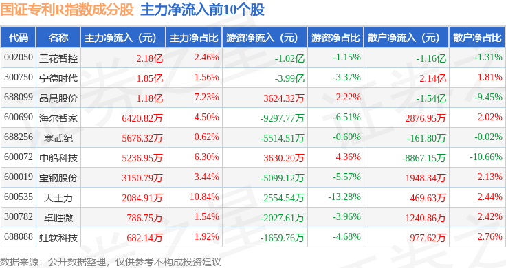 资金流向方面,国证专利R(480070)指数成份股当日主力资金净流出合计122.54亿元,游资资金净流入合计19.6亿元,散户资金净流入合计102.94亿元。成份股资金流向详情见下表: