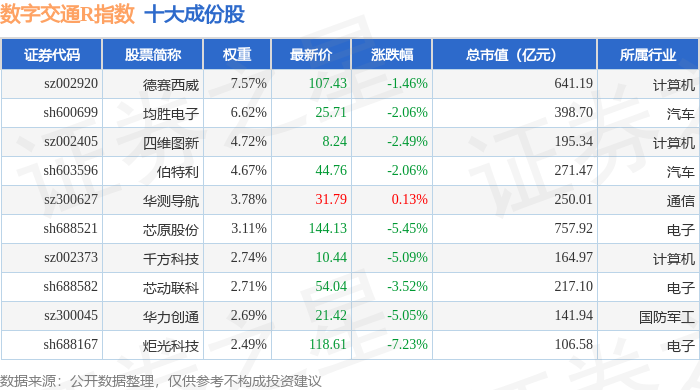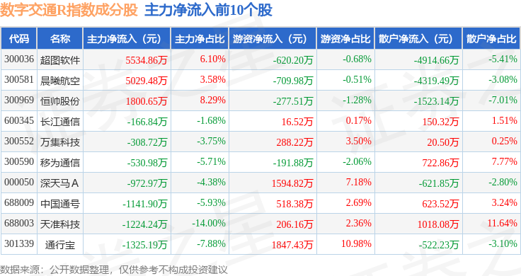 资金流向方面,数字交通R(480075)指数成份股当日主力资金净流出合计24.38亿元,游资资金净流入合计4.9亿元,散户资金净流入合计19.47亿元。成份股资金流向详情见下表: