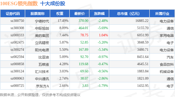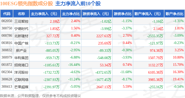 资金流向方面,100ESG领先(970030)指数成份股当日主力资金净流出合计100.95亿元,游资资金净流入合计29.93亿元,散户资金净流入合计71.03亿元。成份股资金流向详情见下表: