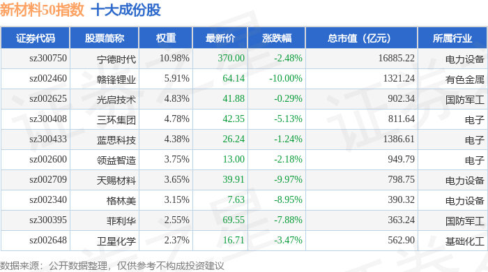 新材料50(970042)指数十大成份股详情如下: