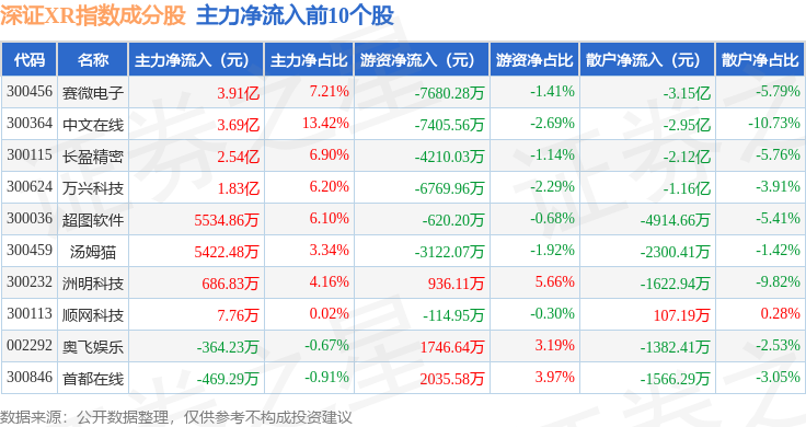 资金流向方面,深证XR(970046)指数成份股当日主力资金净流出合计25.85亿元,游资资金净流入合计4.18亿元,散户资金净流入合计21.67亿元。成份股资金流向详情见下表: