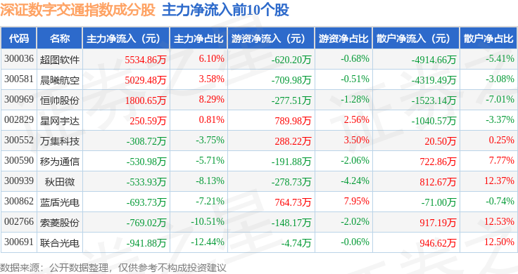 资金流向方面,深证数字交通(970049)指数成份股当日主力资金净流出合计15.75亿元,游资资金净流入合计2.17亿元,散户资金净流入合计13.58亿元。成份股资金流向详情见下表: