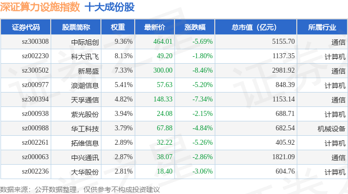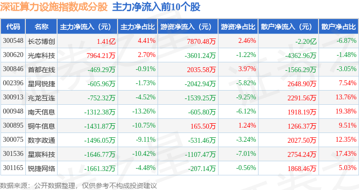 资金流向方面,深证算力设施(970051)指数成份股当日主力资金净流出合计94.61亿元,游资资金净流入合计33.43亿元,散户资金净流入合计61.19亿元。成份股资金流向详情见下表: