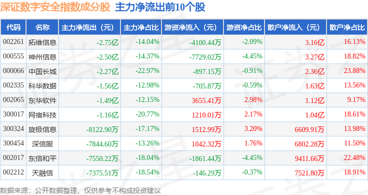 资金流向方面,深证数字安全(970052)指数成份股当日主力资金净流出合计26.75亿元,游资资金净流出合计8335.03万元,散户资金净流入合计27.58亿元。成份股资金流向详情见下表: