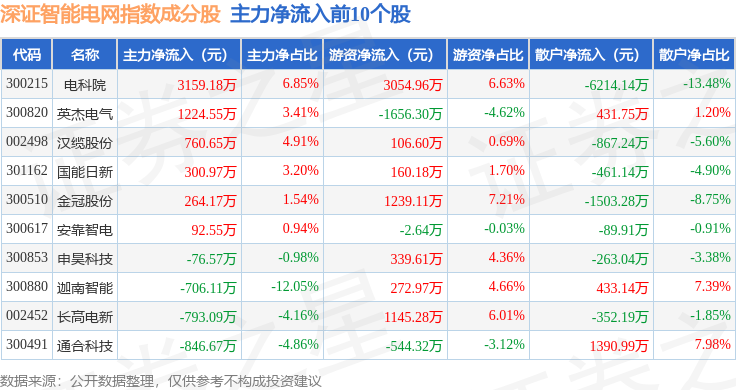 资金流向方面,深证智能电网(970054)指数成份股当日主力资金净流出合计30.55亿元,游资资金净流入合计6.68亿元,散户资金净流入合计23.87亿元。成份股资金流向详情见下表: