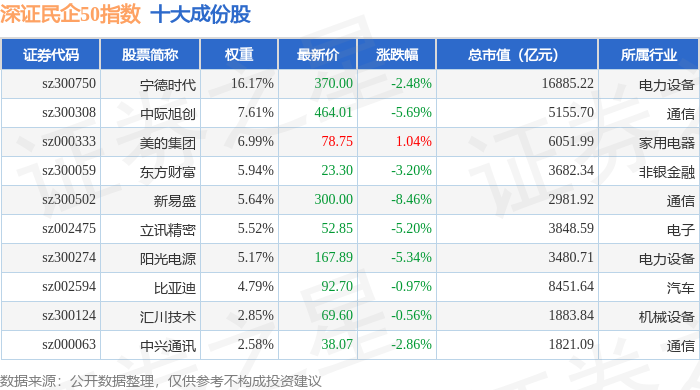 证券之星消息,11月21日,深证民企50(970057)指数报收于3143.85点,跌3.26%,成交1393.18亿元,换手率1.88%。当日该指数成份股中,上涨的有3家,三花智控以1.77%的涨幅领涨,下跌的有46家,格林美以8.95%的跌幅领跌。