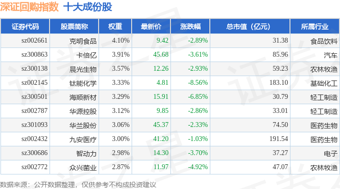 深证回购(970063)指数十大成份股详情如下: