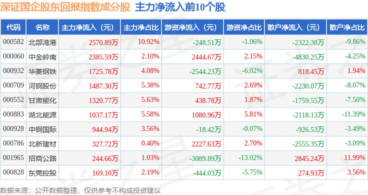 资金流向方面,深证国企股东回报(970064)指数成份股当日主力资金净流出合计23.76亿元,游资资金净流入合计4.35亿元,散户资金净流入合计19.41亿元。成份股资金流向详情见下表: