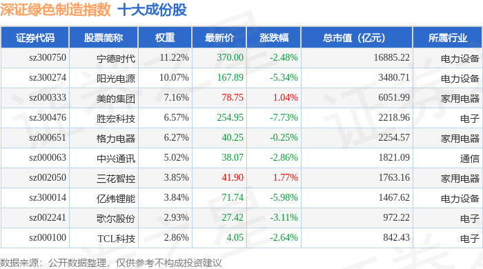 证券之星消息,11月21日,深证绿色制造(970069)指数报收于1788.54点,跌3.19%,成交1010.73亿元,换手率2.12%。当日该指数成份股中,上涨的有4家,三花智控以1.77%的涨幅领涨,下跌的有45家,赣锋锂业以10.0%的跌幅领跌。
