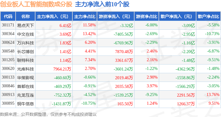 资金流向方面,创业板人工智能(970070)指数成份股当日主力资金净流出合计60.51亿元,游资资金净流入合计28.8亿元,散户资金净流入合计31.71亿元。成份股资金流向详情见下表: