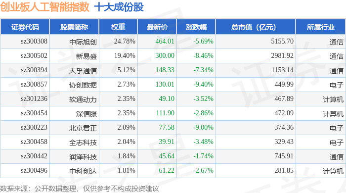 创业板人工智能(970070)指数十大成份股详情如下: