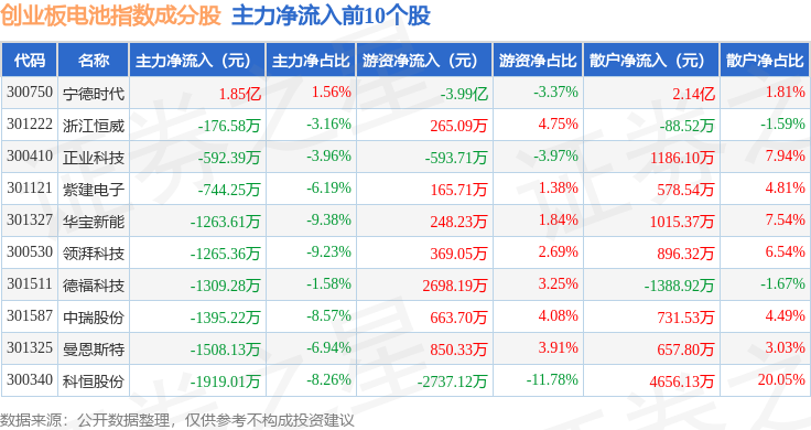 资金流向方面,创业板电池(970081)指数成份股当日主力资金净流出合计50.04亿元,游资资金净流出合计2.63亿元,散户资金净流入合计52.67亿元。成份股资金流向详情见下表: