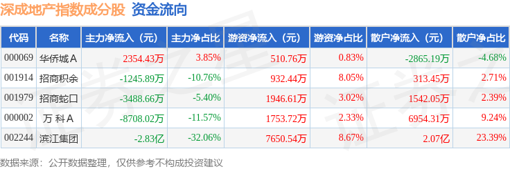 资金流向方面,深成地产(971001)指数成份股当日主力资金净流出合计3.94亿元,游资资金净流入合计1.28亿元,散户资金净流入合计2.66亿元。成份股资金流向详情见下表: