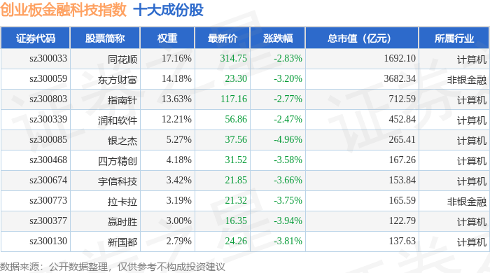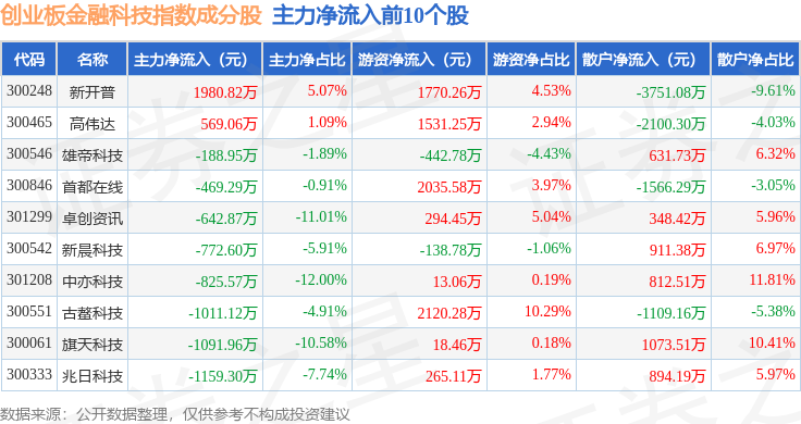 资金流向方面,创业板金融科技(970085)指数成份股当日主力资金净流出合计35.25亿元,游资资金净流入合计8.45亿元,散户资金净流入合计26.79亿元。成份股资金流向详情见下表:
