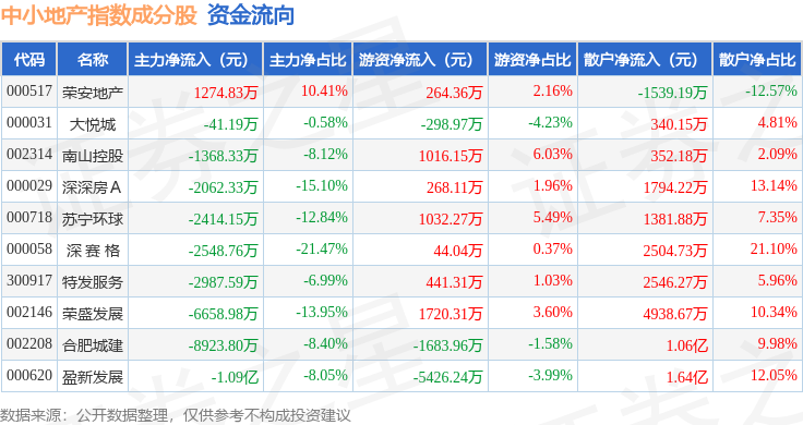 资金流向方面,中小地产(971002)指数成份股当日主力资金净流出合计3.67亿元,游资资金净流出合计2622.62万元,散户资金净流入合计3.93亿元。成份股资金流向详情见下表: