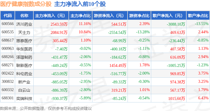 资金流向方面,医疗健康(980016)指数成份股当日主力资金净流出合计24.86亿元,游资资金净流入合计3.0亿元,散户资金净流入合计21.87亿元。成份股资金流向详情见下表: