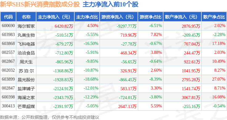 资金流向方面,新华SHS新兴消费(989006)指数成份股当日主力资金净流出合计20.71亿元,游资资金净流入合计4.11亿元,散户资金净流入合计16.59亿元。成份股资金流向详情见下表:
