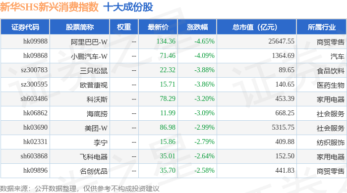 新华SHS新兴消费(989006)指数十大成份股详情如下: