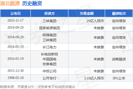 证券之星消息,根据天眼查APP于11月17日公布的信息整理,湖北能源集团股份有限公司定向增发融资,融资额29亿人民币,参与投资的机构包括三峡集团。