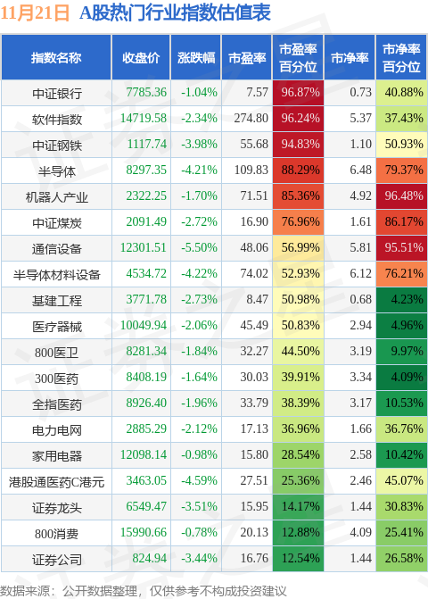 热门行业指数方面,中证银行的市盈率百分位较高,为96.87%。而证券公司的市盈率百分位较低,为12.54%。
