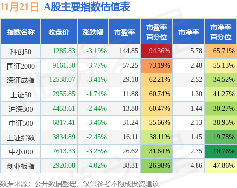 证券之星消息,11月21日A股收盘,上证综指指跌2.45%,报收3834.89点;深圳成指跌3.41%,报收12538.07点;创业板指跌4.02%,报收2920.08点。