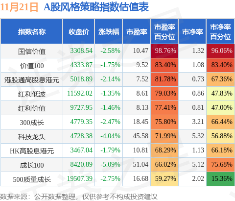 风格策略指数方面,国信价值的市盈率百分位较高,为98.76%。而500质量成长的市盈率百分位较低,为59.27%。