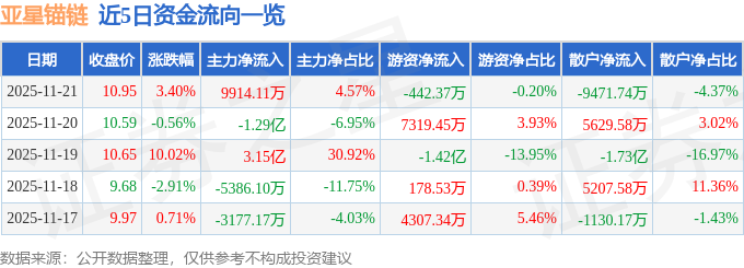 证券之星消息,截至2025年11月21日收盘,亚星锚链(601890)报收于10.95元,上涨3.4%,换手率20.84%,成交量199.98万手,成交额21.69亿元。