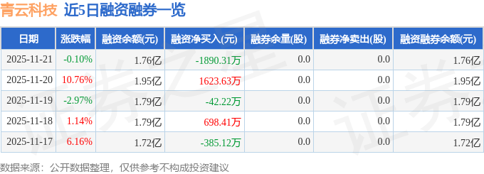 青云科技融资融券信息显示,融资方面,当日融资买入4527.59万元,融资偿还6417.91万元,融资净偿还1890.31万元。融券方面,融券卖出0.0股,融券偿还0.0股,融券余量0.0股,融券余额0.0万元。融资融券余额1.76亿元。